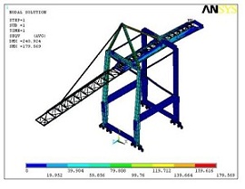 依據(jù)起重機(jī)實(shí)際運(yùn)行工況及GB/T 3811-2008《起重機(jī)設(shè)計(jì)規(guī)范》,結(jié)構(gòu)強(qiáng)度計(jì)算應(yīng)按有風(fēng)工作狀態(tài)下的載荷組合B進(jìn)行即: 1)滿(mǎn)載小車(chē)位于主梁跨中,大車(chē)、小車(chē)同時(shí)運(yùn)行制動(dòng),風(fēng)力平行于大車(chē)軌道;2)滿(mǎn)載小車(chē)位于有效懸臂端,大、小車(chē)同時(shí)運(yùn)行制動(dòng),風(fēng)力平行于大車(chē)軌道。由于主梁跨度L≥30m,支腿采用一剛一柔的結(jié)構(gòu)形式。材料Q235,安全系數(shù)1.33,許用應(yīng)力176.69MPa。