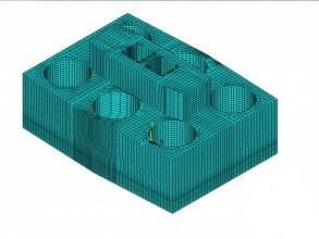 網(wǎng)格劃分質(zhì)量的好壞直接影響計(jì)算結(jié)果的準(zhǔn)確性及收速度,同時由于Solid65單元本身是采用彌散裂縫模型和最大拉應(yīng)力開裂判據(jù),很多情況下會因?yàn)閼?yīng)力集中而使混凝土提前破壞,因此,在實(shí)際應(yīng)用過程中應(yīng)該對單元劃分進(jìn)行有效控制,根據(jù)大量的計(jì)算,本計(jì)算模型只要當(dāng)最小單元尺寸不小于2cm時,就可以有效的避免應(yīng)力集中帶來的問題,同時考慮要得到合理計(jì)算精度和恰當(dāng)?shù)氖諗克俣,?jì)算模型單元尺寸均取為2cm。